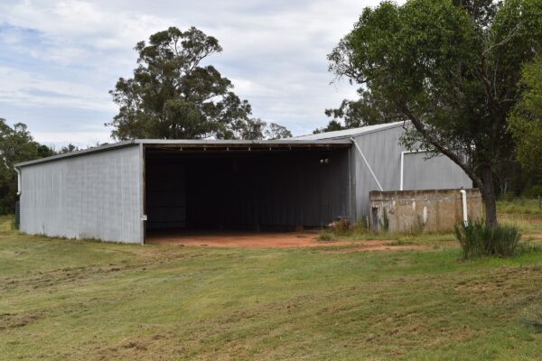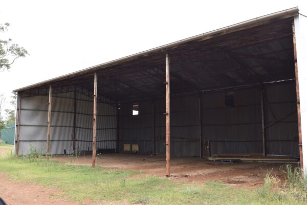 25m x 10m steel frame 4 bay hay shed. Enclosed on 3 sides.