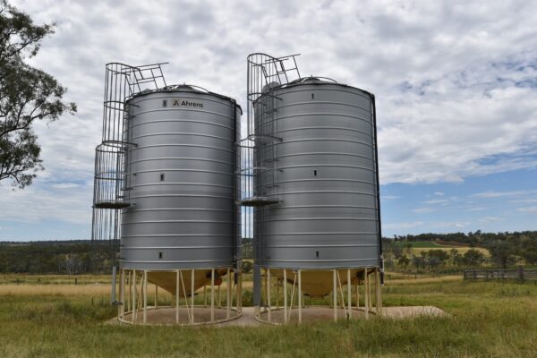 2 x 85 tonne Ahrens conical base grain silos with electric aerators on concrete base.
