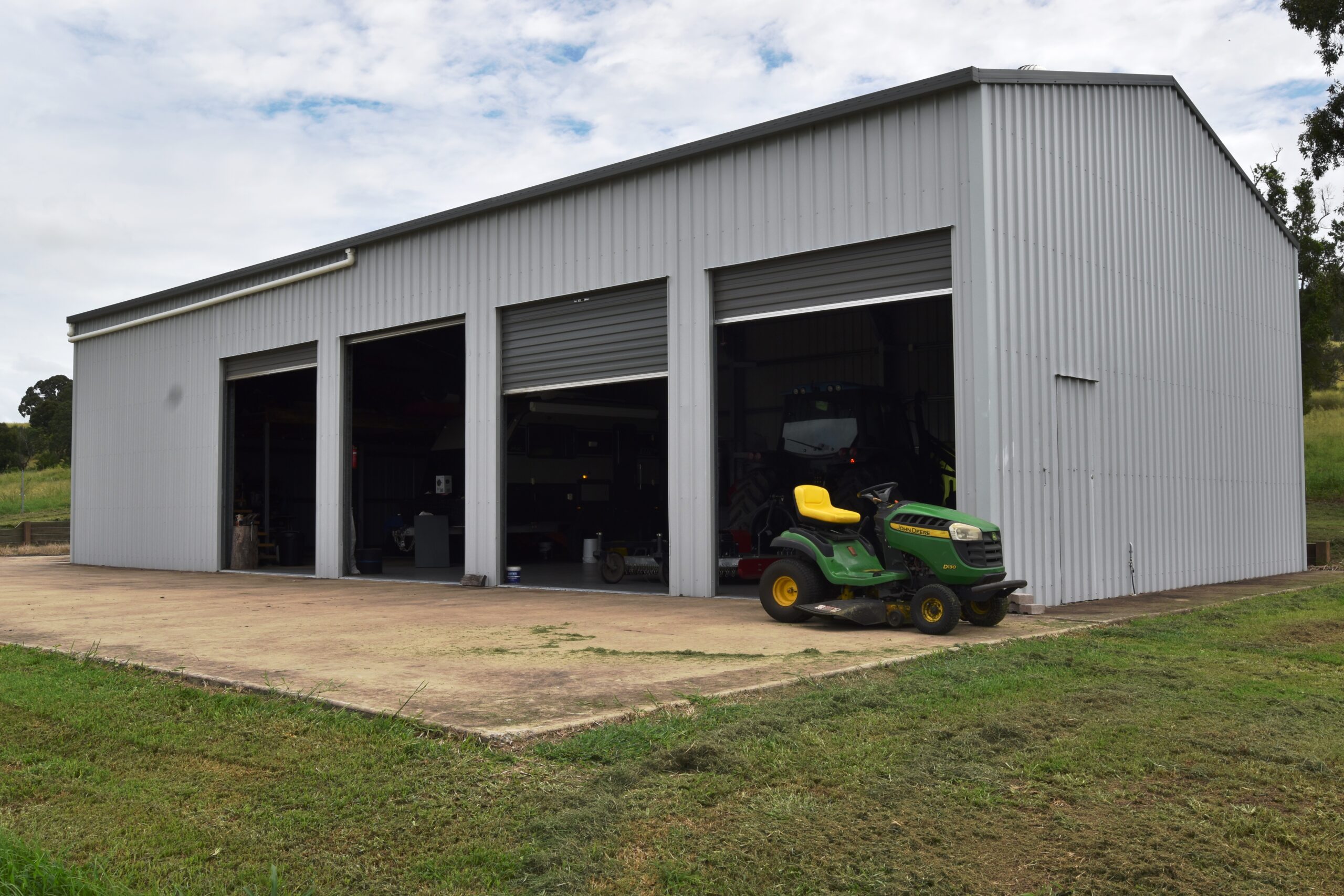 Near new 18m x 9m steel frame, Colourbond, 6 bay shed with 2 automatic & 2 manual roller doors, mezzanine floor, concreted floor, 3 phase power & 6m concrete apron plus concrete washdown bay.